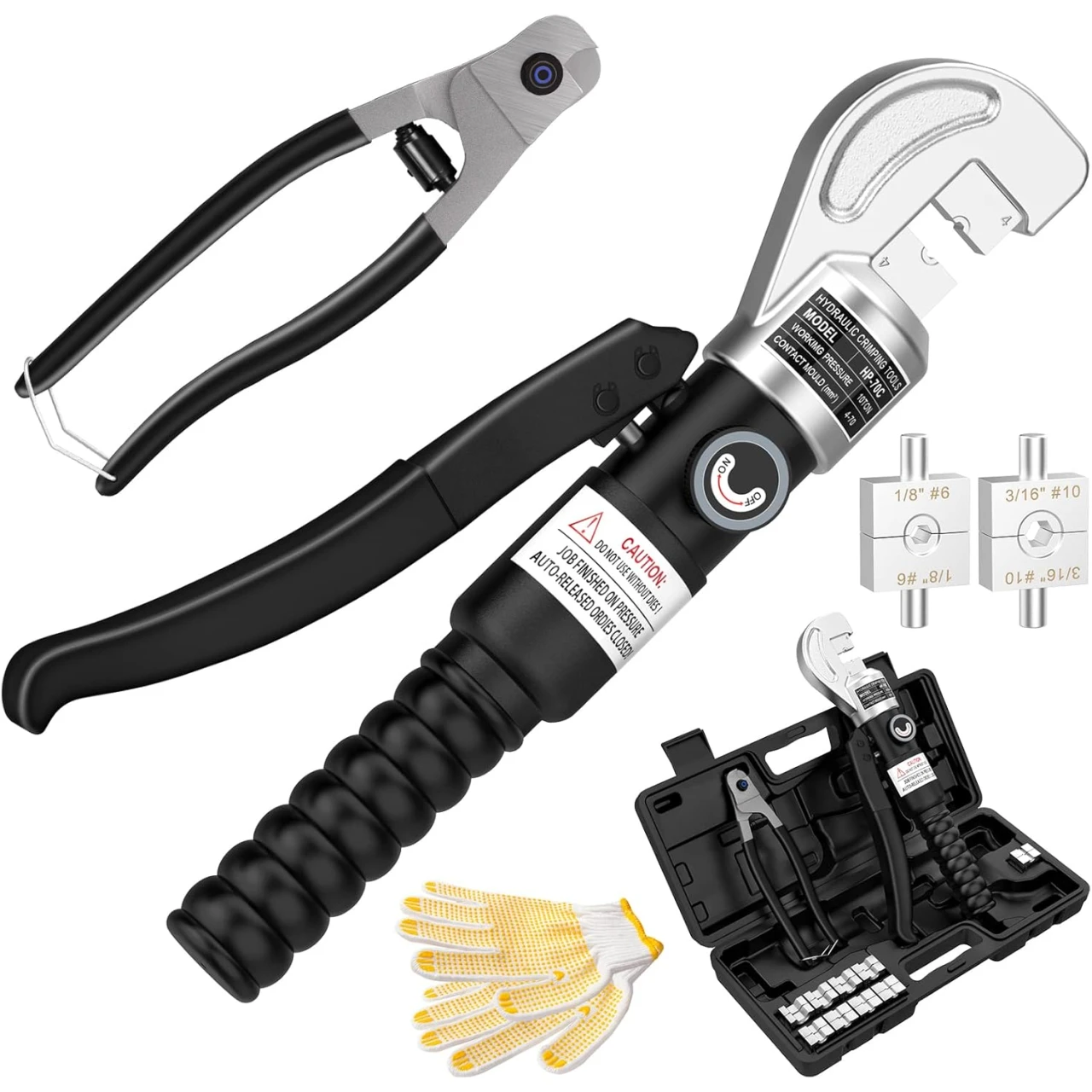 The Posh Collection Hydraulic Crimping Tool Set offers effortless crimping with 8 tons of power, making it perfect for electrical, battery, and cable installations. It includes a versatile 9-die set for various cable sizes, ensuring reliable wire connections. The kit also comes with a cable cutter and gloves for added convenience and safety. With its user-friendly design and rugged construction, this hydraulic crimping tool provides precise and long-lasting performance for novices and experts alike.