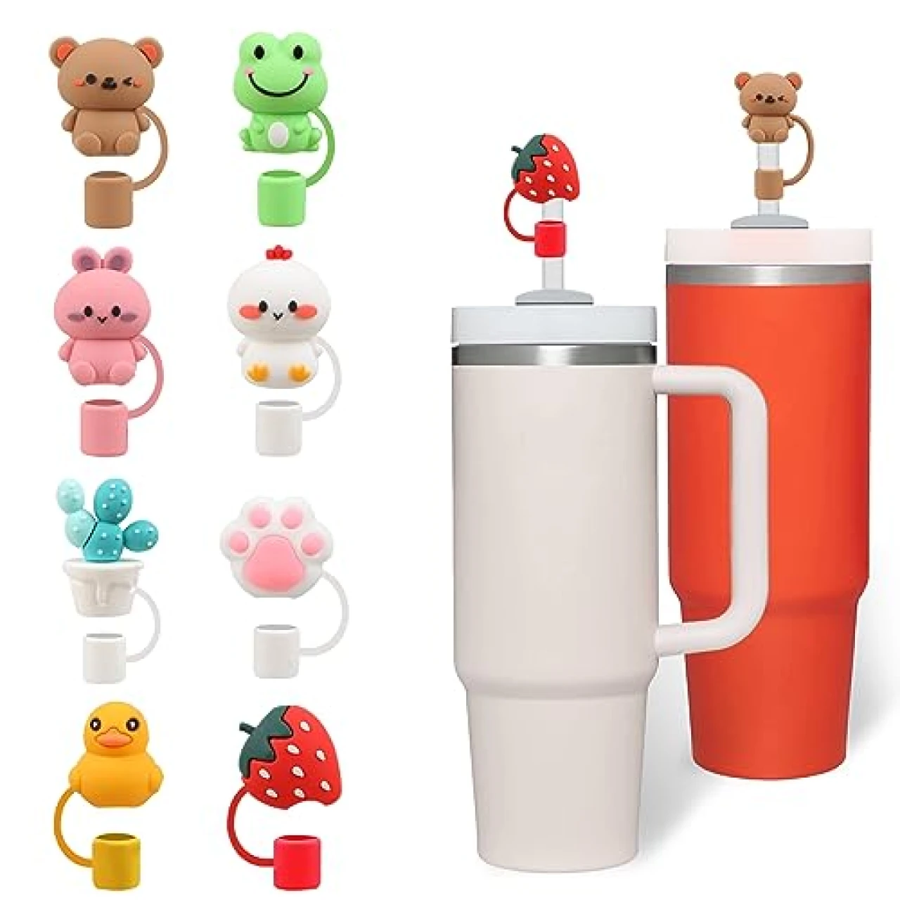 Suitable for use with Stanley 30&40 Oz Tumbler and Simple Modern with Handle, these 8pcs silicone straw covers caps are a cute and functional accessory for your drinking straws. Made from durable and high-quality silicone, these straw covers are reusable, non-toxic, and tasteless. They provide a dust-proof decorative effect and are reliable and long-lasting. Easy to use, these straw covers can be fixed directly on the straws without falling off. The set includes 8 cute straw toppers in different shapes, such as strawberry, cactus, bear, rabbit, chicken, duck, cat paw, and frog, offering a variety of cute looks. Not only do these straw covers decorate your drink straw, but they also serve as dust and splash-proof protection. These silicone straw tips make a perfect gift for anyone who owns a Stanley cup 30&40 Oz tumbler or Simple Modern with handle. Please note that the straws themselves are not included in your order.